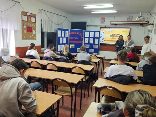 Na początku spotkania uczniowie obejrzeli bogato ilustrowaną prezentację, która w przystępny sposób wyjaśniała, czym jest wirus HIV i dlaczego, mimo że rzadziej o nim słyszymy, wciąż stanowi realne zagrożenie. Wystąpienie pani Polinceusz dostarczyło nam wielu cennych informacji dotyczących dróg zakażenia, metod diagnostyki oraz współczesnych możliwości leczenia. Uczniowie mieli również możliwość zadawania pytań i rozwiania wszelkich wątpliwości dotyczących ryzyka zakażenia. Szczególną uwagę zwrócono na sposoby ochrony zdrowia własnego i bliskich oraz na świadome podejmowanie decyzji sprzyjających profilaktyce. Spotkanie było wartościową lekcją odpowiedzialności i świadomego dbania o zdrowie, a zdobyta wiedza z pewnością pomoże młodzieży lepiej zrozumieć problematykę HIV/AIDS i bezpieczniej funkcjonować w codziennym życiu.